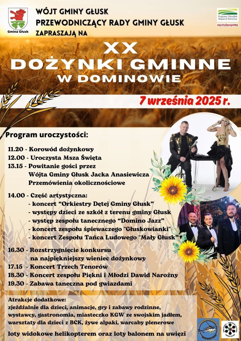 To właśnie starostowie poprowadzą dożynkowy korowód, który uformują delegacje poszczególnych sołectw i ogrodów działkowych. O 12.00 na placu przy Urzędzie Gminy w Dominowie zostanie odprawiona dziękczynna msza święta, a po modlitwie odbędzie się tradycyjny obrzęd dzielenia chlebem. Wójt Jacek Anasiewicz razem ze starostami podzieli tradycyjny bochen, częstując nim dożynkowych gości.
